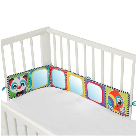 sengerand med 4 spejle på den ene side, og farverige dyr på den anden. Randen kan, ved hjælp af de medfølgende clips, stå frit, så barnet kan se sig selv fra flere sider.- Varenr.