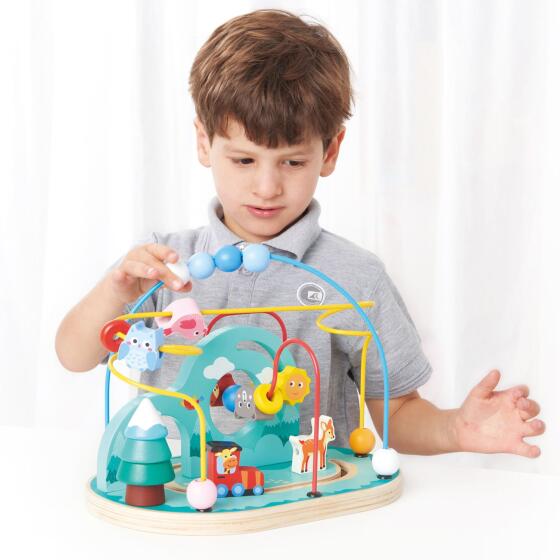 Tag en tur i skoven med denne sjove og motorisk stimulerende labyrint i træ og metal. Klodserne på den store labyrint er formet med dyr fra skoven, som ræv, ugle, bjørn og en fugl som også kan "bevæge sig gennem bjerget". På træpladen kan der køres med toget rundt om bjerget, forbi dådyr og solen gå op og ned. Det er en flot labyrint i retro / art-deco grøn fra Lenin, som er klassisk lærende legetøj. Godkendt fra 1 år - mærke: Lelin Mål: 20 x 29,5 x 21,8 cm høj.- Varenr.