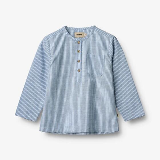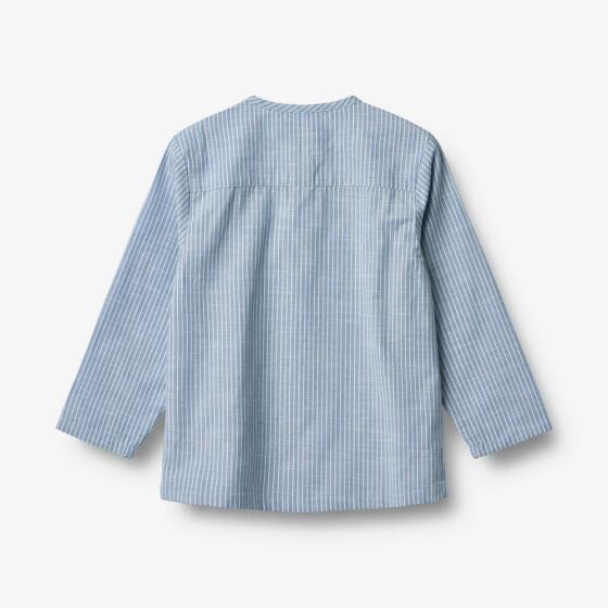 Langærmet skjorte med striber i blød vævet økologisk bomuld til børn. - Normal pasform - Mandarinkrave - Brystlomme - Stolpelukning med knapper halvvejs ned foran - Vævet metervare med striber- Varenr.