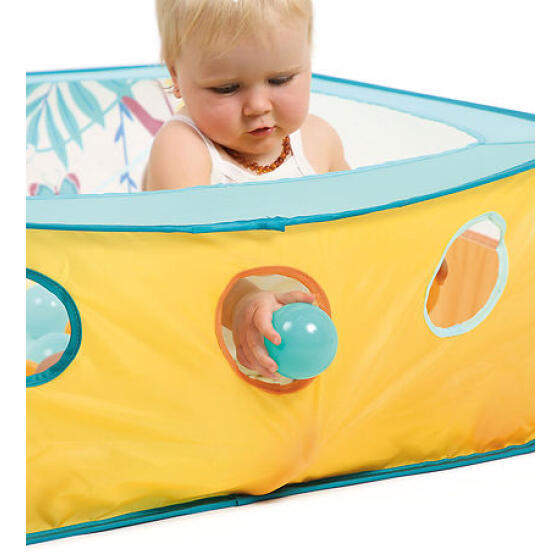 Skøn Ludi kravlegård i et jungletema, med 40 bolde medfølgende i forskellige farver og en taske til opbevaring. Ludi kravlegården kan både bruges indendørs og udendørs, og den lægger op til masser af leg for både store og små. Siderne har dele i transparente materialet og på den ene side er der tre huller. Kravlegården kan nemt flyttes rundt på, og boldene kan nemt ligge indeni, når den er pakket sammen. Anbefalet alder: 6 mdr.+ Dimensioner: - Kravlegård: 80 x 80 x 30 cm - Bolde: 6 cm Fremstillet af: - Kravlegård: 100% polyester - Bolde: 100% PVC- Varenr.