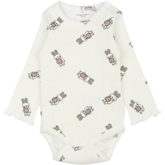 Langærmet ribstrikket bodysuit med et sødt mønster af smilende kaniner. Denne charmerende bodysuit fra THE NEW siblings er perfekt til sæsonen, og den er perfekt til både hverdag og særlige lejligheder. Den har søde blondedetaljer omkring åbningerne på kroppen. Kombiner med de matchende TNSBPippa leggings for et sødt sæt. - Normal pasform. - Lange ærmer. - Rund halsudskæring. - Ribstrik - Smiling rabbits AOP (helt print). - Trykknaplukning i skridtet og på den ene skulder. - GOTS Organic certificeret af CU842535- Varenr.
