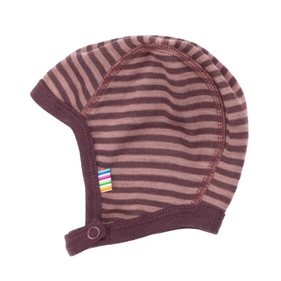 Elegant Joha babyhjelm med stribemønster. Joha babyhjelmen har en rund form, der omslutter hovedet nænsomt. Åbningen er kantet med en smal rib, og der er en praktisk trykknaplukning med to indstillinger. Babyhjelmen har et lille farverige logomærke på siden. Babyhjelmen er i en lækker blanding af merinould og polyamid.- Varenr.