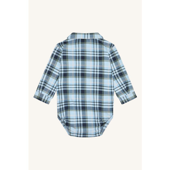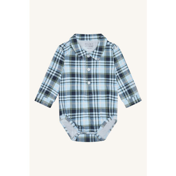 Smart Hust and Claire skjortebody Hust and Claire skjortebodyen har en kinakrave og kan åbnes fortil med tre, brune knapper. Den har lange ærmer med brede kanter i ærmeåbningerne. Skjortebodyen lukkes med tre trykknapper mellem benene. Fremstillet af: - 95% økologisk bomuld - 5% elastan- Varenr.