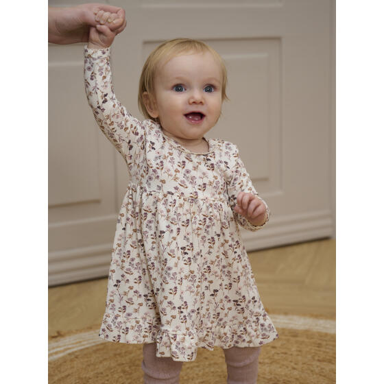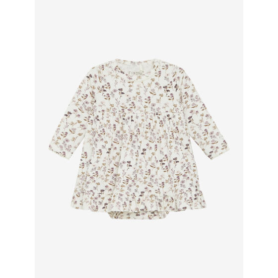 Sød bodykjole med heldækkende print fra FIXONI. Bodykjolen har et skørt med rynkning omkring taljen, lange ærmer og lukkes med trykknapper mellem benene og ved skulderen. Dette produkt indeholder TENCEL™-fibre. TENCEL™ er et varemærke tilhørende Lenzing AG. Sammensætning: 50% Modal/ 46% Bomuld/ 4% Elastan- Varenr.