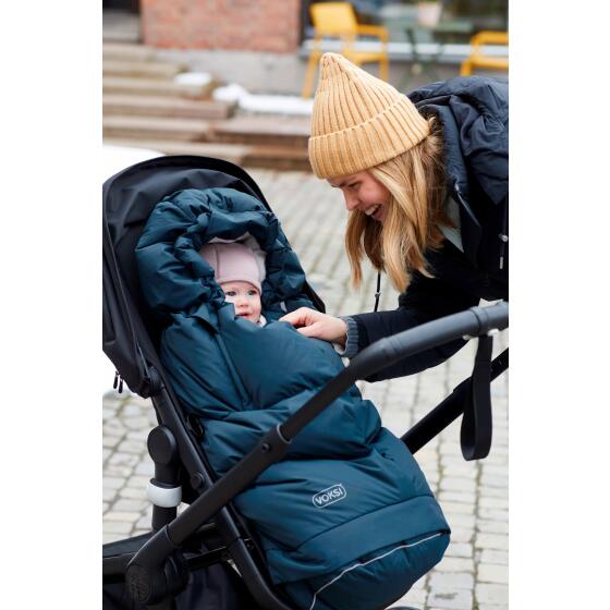 City North har en lang levetid, lige fra barnet er nyfødt og helt op til 4 år med den integrerede forlængerdel. Køreposen består af naturlige og kvalitetssikre materialer som uld og dun. Der er uld i ryggen, som temperaturregulerer og sørger for at barnet holdes tørt. Fyldet i overdelen består af højkvalitetsdun og syningerne er lavet med en unik bokskonstruktion, der hindrer kulde i at slippe ind. Det er luften mellem dunfibrene, som giver maksimal isolering og holder barnet varmt i det kolde vejr. Tekstilet på indersiden er fremstillet af blød bomuld, som gør det behageligt for barnet at ligge på. Yderstoffet er vindtæt, har en vandsøjle på 8000 og er behandlet med BIONIC-FINISH®ECO. Når det regner kraftigt, anbefaler vi dog at bruge et regnslag på ydersiden. Alle materialerne i Voksi City North er OEKO-TEX®standard 100, klasse 1 certificeret, som er et kvalitetsstempel, der sikrer at ingen af materialerne i produktet indeholder skadelige kemikalier. Designet er med innovative armåbninger, der kan åbnes og lukkes med lynlås, og giver barnet mulighed for at få hænderne fri og tage aktiv del i sine omgivelser - samtidig med at det holder sig varmt i køreposen! Den unikke udformning af rygåbningen gør at køreposen nemt kan monteres og bruges i vogne med forskellige typer af seler. Det skridsikre materiale i ryggen gør at køreposen ikke skrider ned i klapvognen. En integreret forlængerdel kan nemt åbnes op med lynlås i bunden, når barnet har brug for mere plads. Der medfølger et blødt underlag til hovedet, som både giver ekstra komfort for barnet og beskytter stoffet. Med lynlås i midten af køreposen, har du let adgang til barnet. Den brede yderflap kan bruges til at stramme posen lidt ekstra rundt om barnet. Husk at have godt med luft rundt om hovedet på dit barn og lad det altid sove under opsyn.- Varenr.