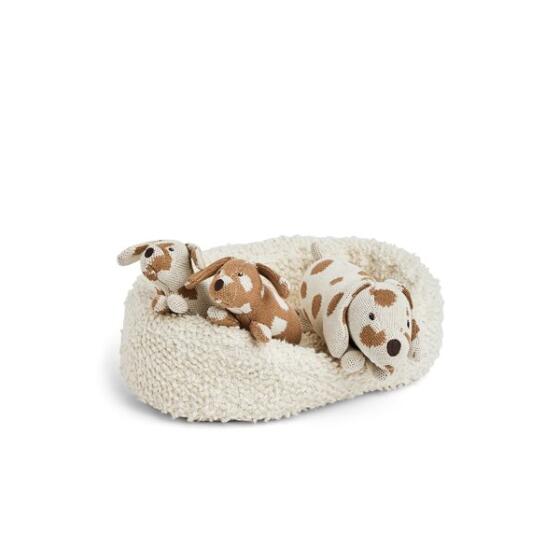 Den skønneste hundekurv med mor og to hvalpe Størrelse på kurv er 30x22 cm, mor hund er 25cm og hvalpene er 17cm Smukke meleret natur og brunlige farver Bomulds strik PET fyld (genanvendte plastik flasker) Alder: 0+ Kan vaskes på håndvaske program STANDARD 100 by OEKO-TEX®- Varenr.
