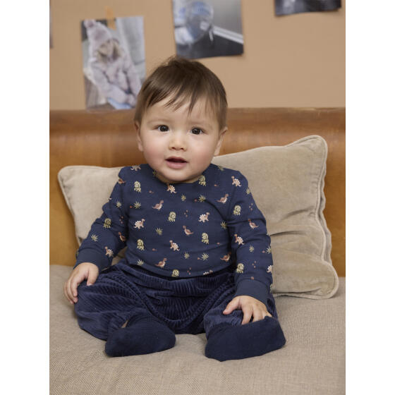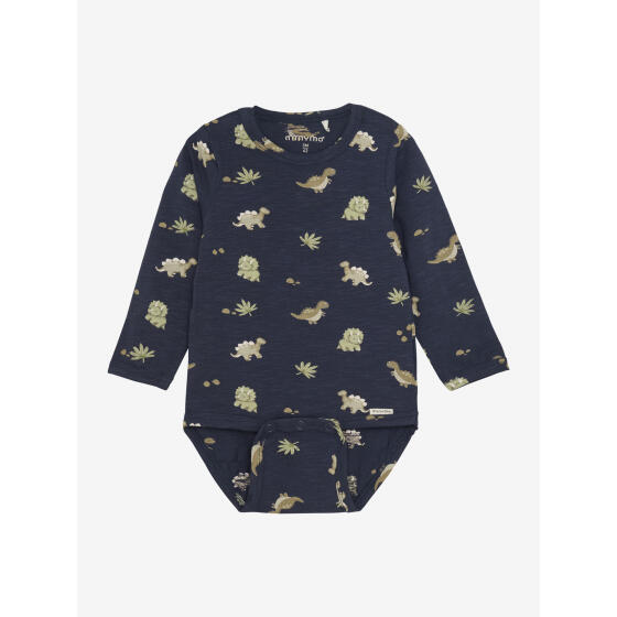 Cool langærmet bodysuit fra Minymo. Bodysummen har et heldækkende dinosaurdesign, perfekt til hverdagsleg. Den har trykknapper mellem benene, hvilket gør den nem at lukke. Bodysummen er lavet af en økologisk bomuldsblanding, der føles behagelig mod huden. Certificeret i henhold til GOTS - økologisk CERES-0366 95% bomuld/ 5% elastan- Varenr.