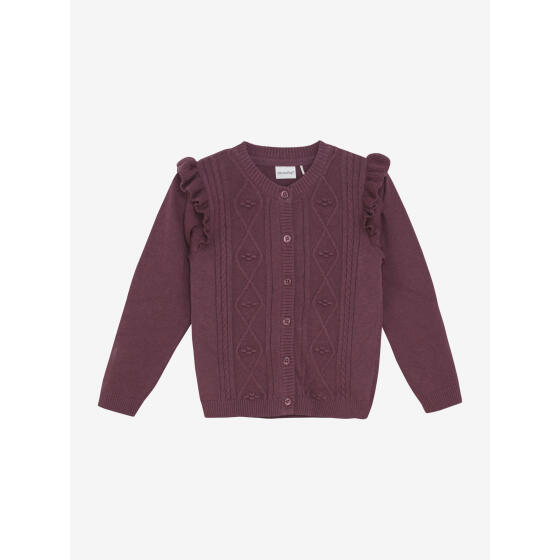 Elegant cardigan fra Minymo. Cardiganen er ensfarvet, hvilket giver den et enkelt look. Den har fine frynsedetaljer på skuldrene og et moderne strikmønster på kroppen. Cardiganen er lavet af fint strikket stof og har fine glimmerknapper hele vejen ned foran, hvilket gør den både praktisk og nem at tage på. Cardiganen er perfekt alene eller til at tilføje et lag-på-lag-outfit til et strejf af stil. Cardiganen er lavet af en økologisk bomuldsblanding og føles blød og behagelig mod huden. 80% bomuld/ 20% uld- Varenr.