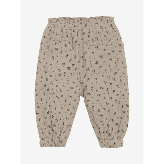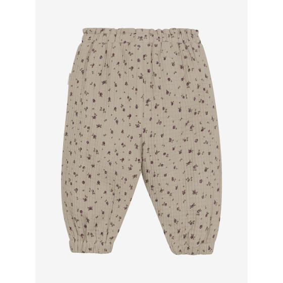 Søde og behagelige bukser med et heldækkende print. Bukserne har fine detaljer såsom lommer med flæser foran, en bred elastisk linning og elastik ved anklerne for en god og behagelig pasform. 100% bomuld- Varenr.