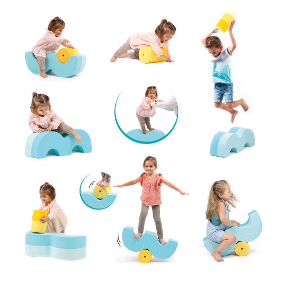 Sjov og leg med motorik Dette sæt indeholder 2 udviklende motorikmoduler for at udvikle koordination og fantasi. De to moduler er lavet af let, meget modstandsdygtigt og stabilt skum, så hvert barn kan have det sjovt i fuld sikkerhed. De små kan læne sig op af den for at lære at rejse sig. Med hjælp fra en voksen vil de være i stand til at overvinde forhindringer ved at gå på dem. De større børn vil være i stand til at lave baner, teste sin balance eller lege vippe ved at bruge begge moduler samtidigt. Modulerne kan også bruges som sæde eller trin.- Varenr.