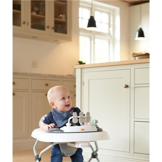 Gåstol som også kan bruges som gålære – med skånsomme og støjsvage hjul og legetøj, der stimulerer barnets sanser. Gåstol med stofsæde til børn der skal lære at gå. Barnet sidder trygt i den stabile stol, mens det lærer at bevæge sig rundt på benene. Stolens høje ryg giver barnet god støtte. Gåstolen er spændende for den lille og stimulerer samtidig sanserne med legetøj, musik og lys. Den har sødt stof i fine og tidssvarende farver og designs. Med gåstolens hastighedsjusterbare hjul, kan du selv bestemme, hvor hurtigt - eller langsomt - gåstolen kan køre. Det sikrer en sikker hastighed, der matcher barnets evne og selvtillid, når de lærer at gå. Du indstiller nemt hastigheden direkte på hjulene. Med håndtaget bag på baby walkeren kan barnet gå bagved og bruge vognen som gålære eller du kan hjælpe lidt til i starten, hvis de små ben har behov for det. Stolen kan dreje hele vejen rundt og har bremseklodser som ekstra sikring ved trapper (vi anbefaler sikkerhedsgitre ved alle trapper). Hjulene har gummibelægning så de er skånsomme mod gulvet og ikke larmer, når den kører på glatte gulve. Hele vognen er højdejusterbar i 3 positioner, så den kan indstilles til at passe til barnets benlængde og når den skal pakkes væk, kan voksne nemt folde den sammen ved et tryk på undersiden, så den fylder mindre. Lege- bordet kan nemt tages af og rengøres med en fugtig klud.- Varenr.