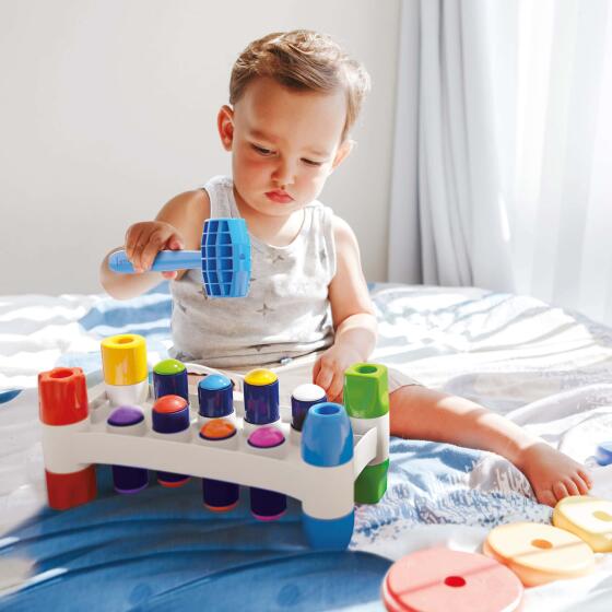 Mor dig med at slå på de farverige pløkker med hammeren! Når du er færdig, kan du vende spillet på hovedet og starte forfra! Stativet kan hæves, så det bliver muligt at slå pløkkerne igennem stativet. Ved at samle pløkkerne op og sætte dem på plads, træner dit barn sin finmotorik og hånd-øje-koordination. Egnet fra 18 måneder.- Varenr.