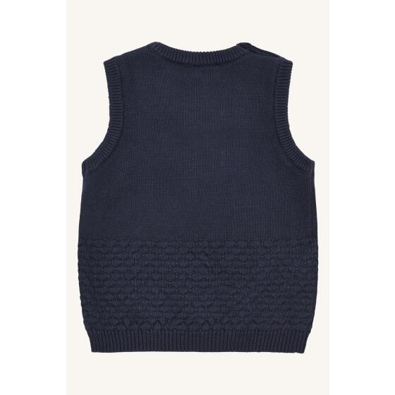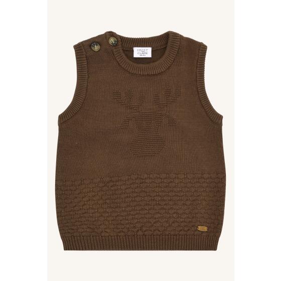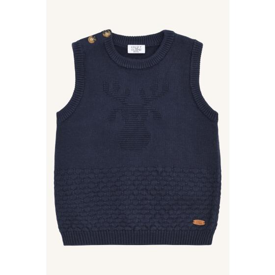 En hyggelig strikket vest lavet af 100% økologisk bomuld, designet til at bringe både komfort og legende charme til din lille ens vintergarderobe. Forsiden har et subtilt elgmotiv strikket direkte ind i stoffet, hvilket skaber en raffineret sæsonbestemt detalje, der føles både klassisk og sjov. Den nederste del af vesten er afsluttet med et tekstureret strikmønster, der tilføjer dybde og en blød, premium-følelse. 100% bomuld (økologisk)- Varenr.