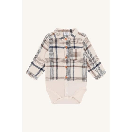 En blød og stilfuld skjortekrop lavet i ren bomuld med et nostalgisk ternet mønster, der bringer et varmt, klassisk look til din lilles garderobe. Designet med en smart krave, træknapper og en lille brystlomme, denne bodystocking blander charmen fra en skjorte med komforten fra en babykrop. Den nederste del er lavet af en strækbar bomuldsblanding for at sikre en blid, fleksibel pasform mod sart hud. 100% bomuld; Ekstra stof 2: 95% bomuld, 5% elastan- Varenr.
