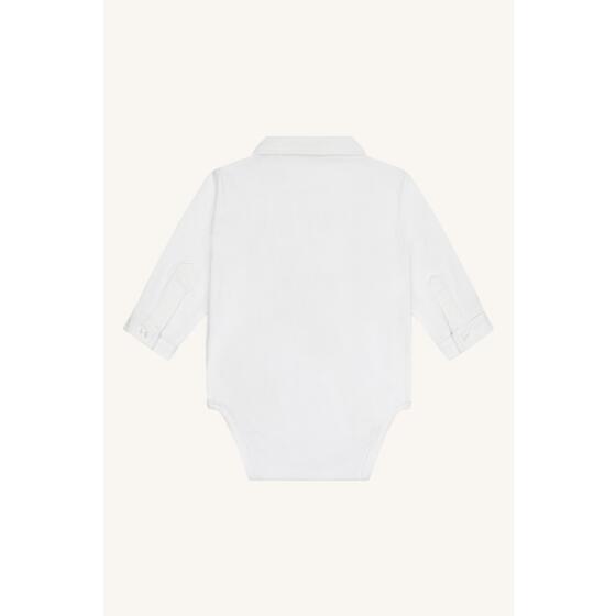 Langærmet bodystocking i jersey med skjortekrave, stolpelukning og manchetter. Bodystockingen har en lille lomme på venstre bryst. Knappes mellem benene. 95% Cotton (organic), 5% Elastane- Varenr.