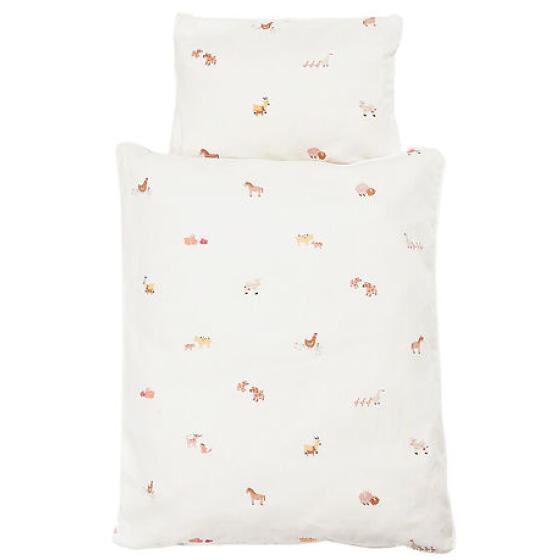 Fint Smallstuff dukkesengetøj i hvid med et print af bondegårdsdyr i en ferskenfarve og andre nydelige nuancer. Smallstuff dukkesengetøjet består af en dyne, der lukkes med lynlås, og en hovedpude, som kan matche barnets eget sengetøj. Sættet kommer i en praktisk pose i samme design. Dimensioner: - Pude: 24 x 17 cm - Dyne: 41 x 34 cm Fremstillet af: - Ydre: 100% bomuld - Fyld: 100% andefjer- Varenr.